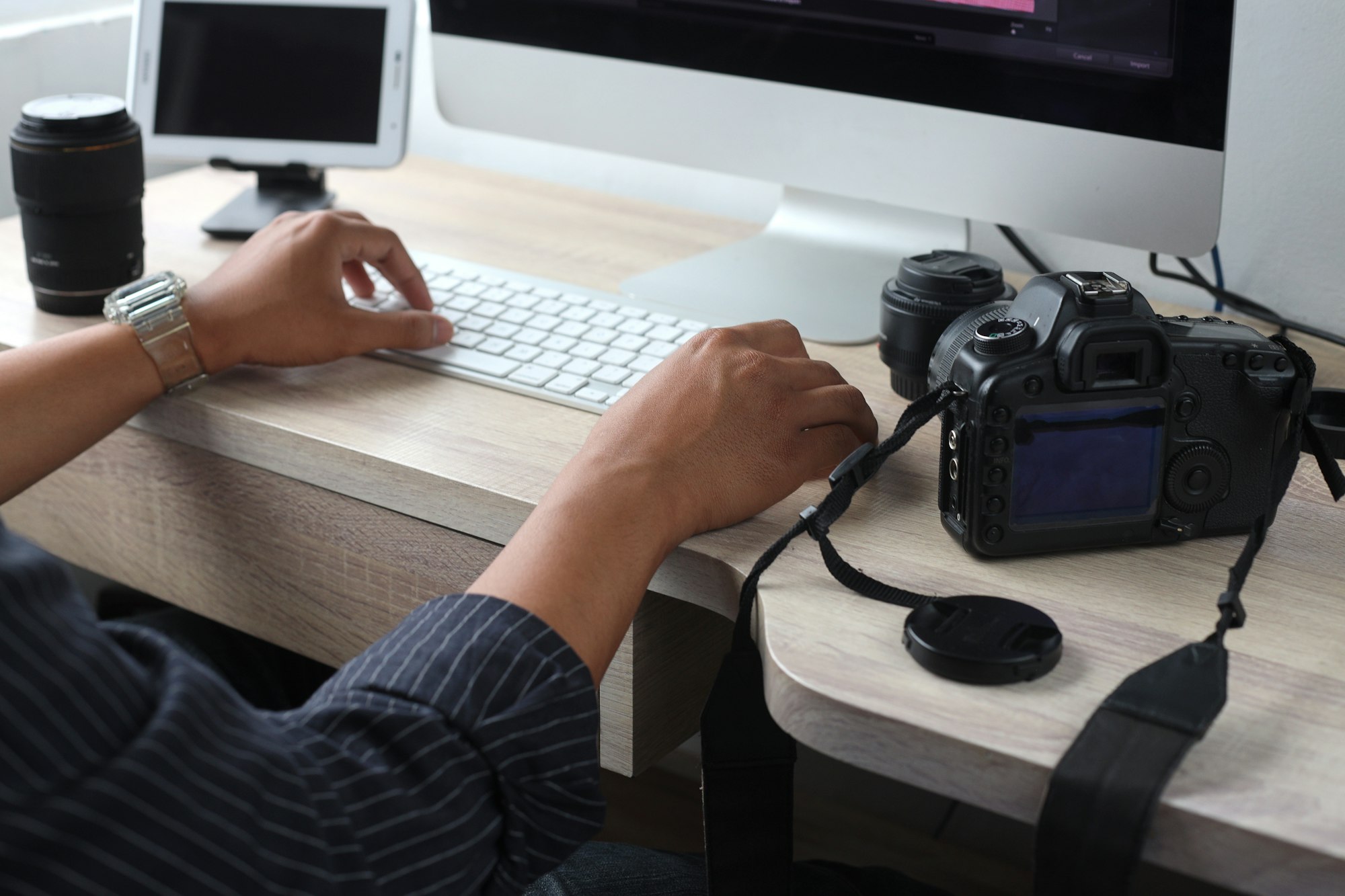 Photographer editing photos at home office
